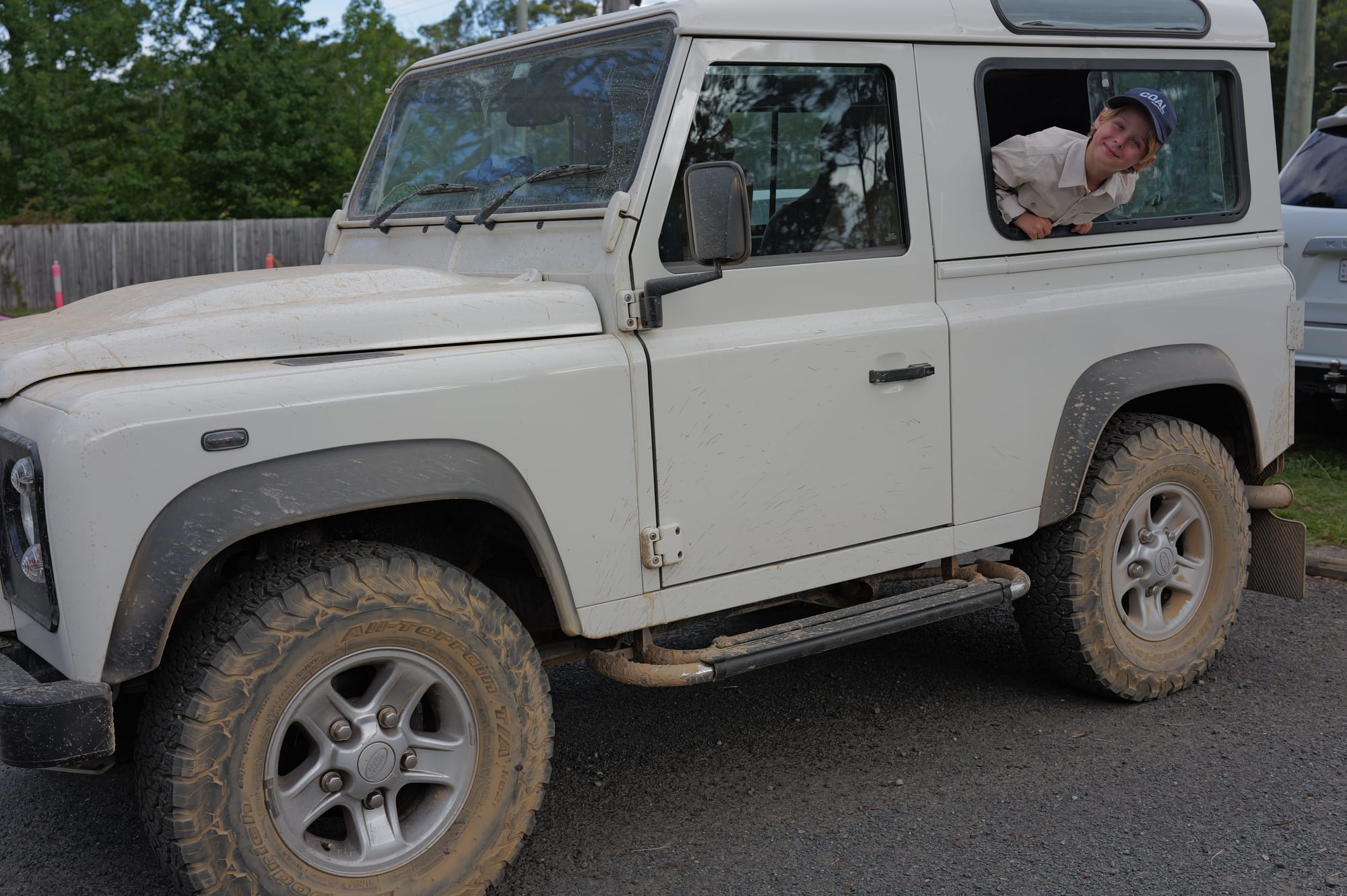 The 90 fixed that. White, short-wheelbase, 2.4-litre TDCi diesel with an automatic conversion that makes the Blue Mountains school run possible without a third leg. Boost alloys. BFG All-Terrains. A Safari Equippers rack on top and a Melville & Moon spare-tyre cover on the back that has faded unevenly in the sun.