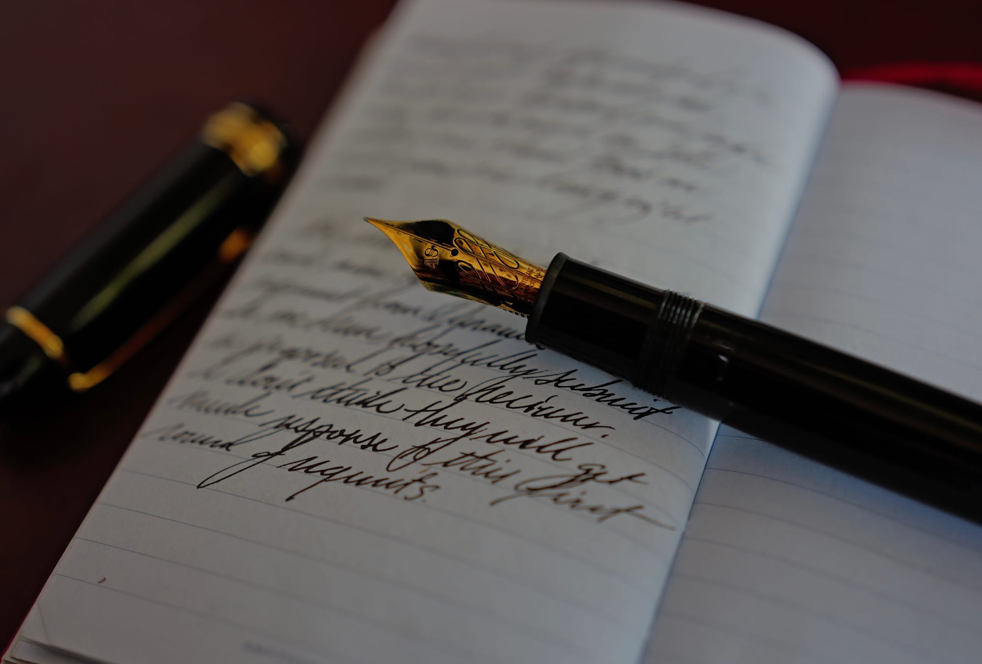 The cap unscrews with a quarter turn and the nib catches the light before it touches paper. There's ink on the gold — there's always ink on the gold. The first stroke lays down wet and dark, wider than you expected, and the room gets a little quieter.